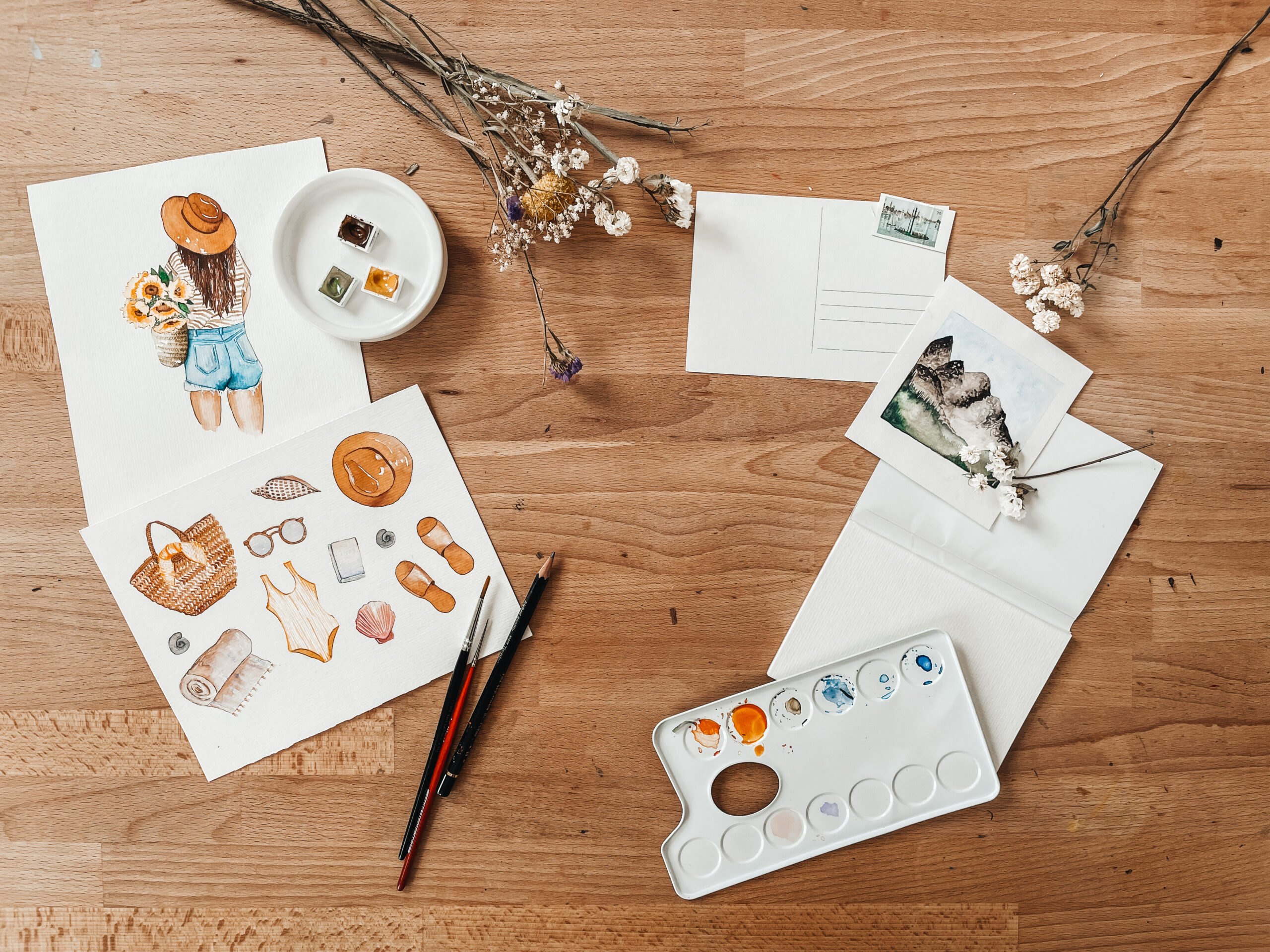 Erlerne von mir Tipps, Tricks und Techniken zum Watercolor Malen und gestalte in diesem Workshop mit Schritt-für-Schrittanleitungen deine eigenen kreativen Urlaubsgrüße mit sommerlichen Watercolormotiven.